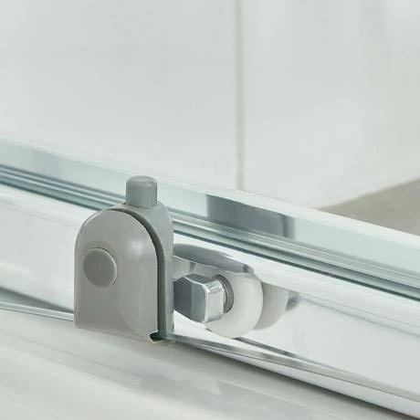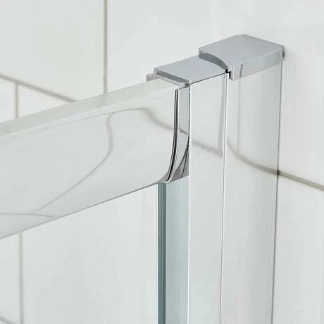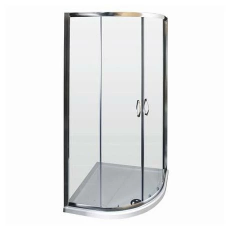 A 900 x 900mm quadrant shower enclosure featuring 5mm toughened safety glass. The frame has a satin chrome finish, and has sliding doors for easy access.